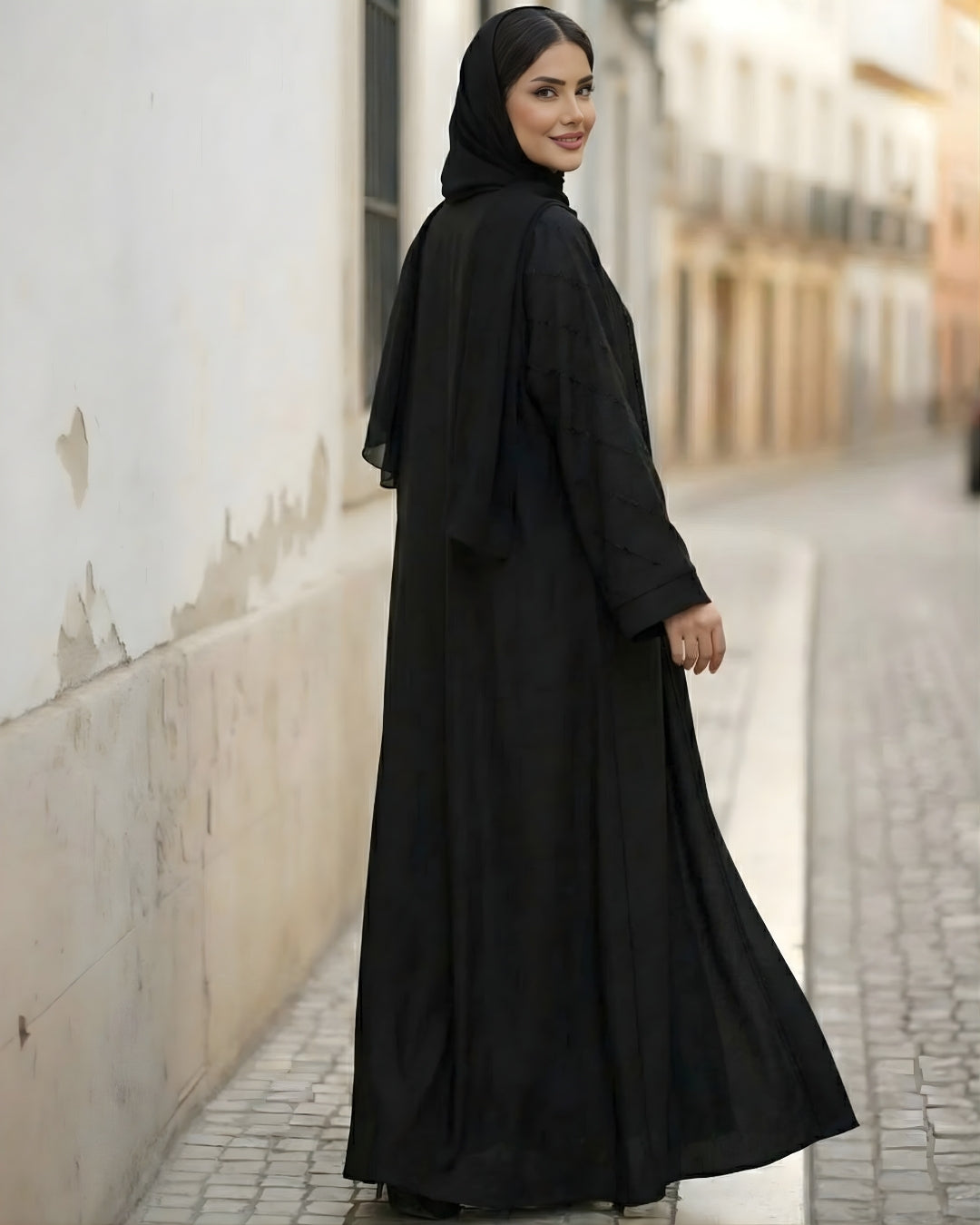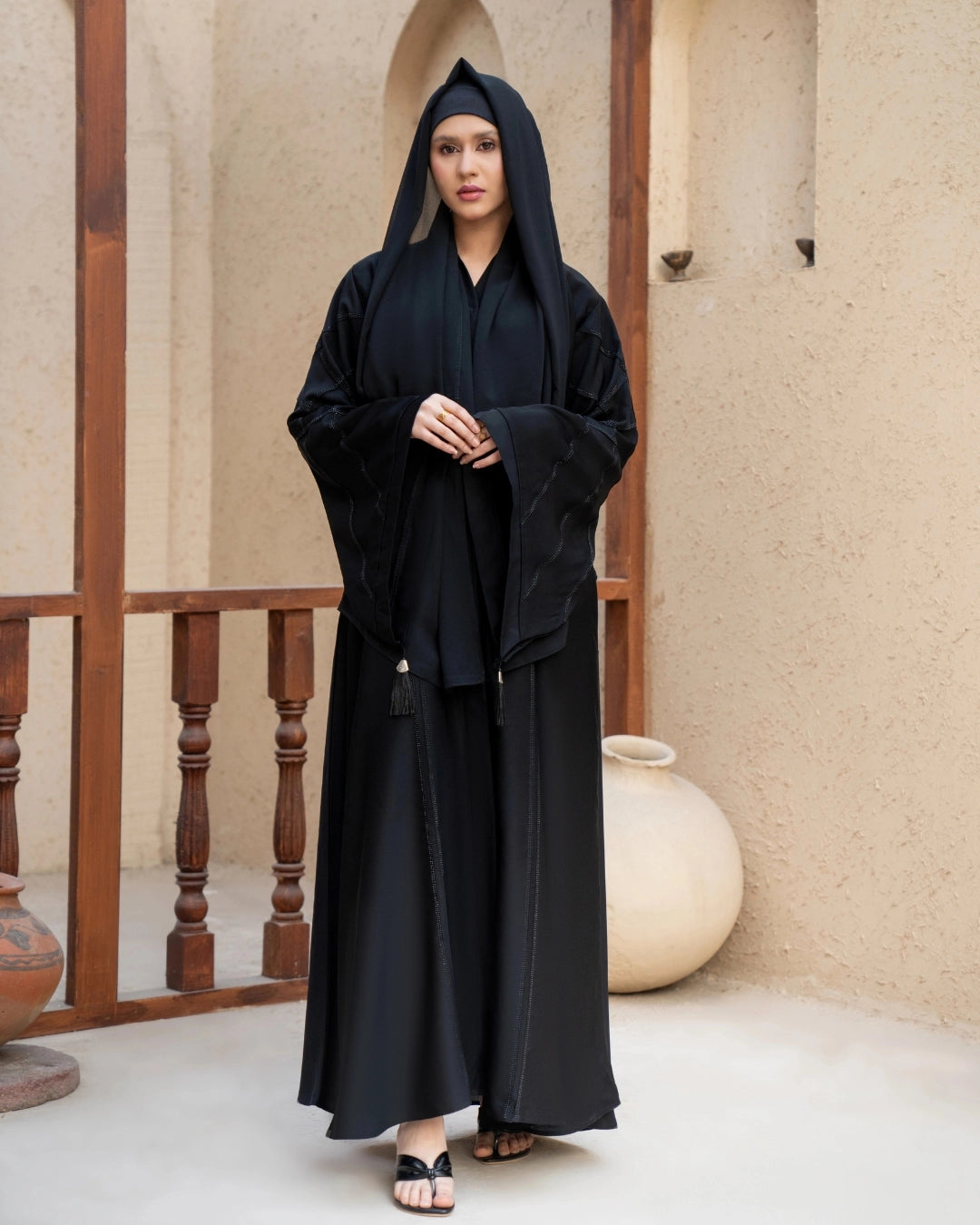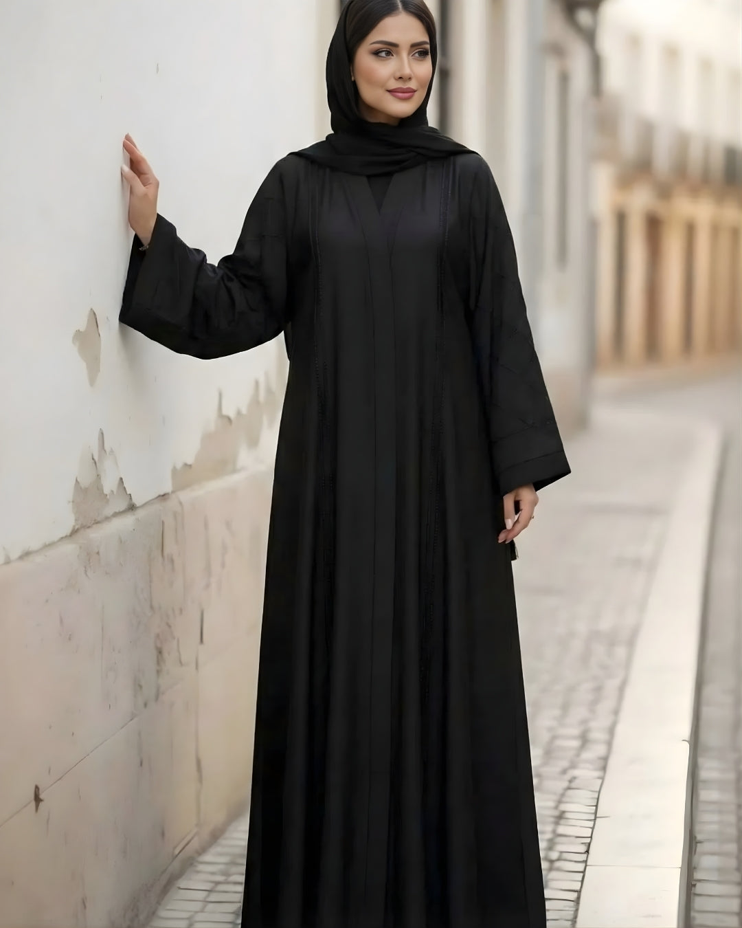 Alishba is a graceful abaya designed to elevate everyday modest wear with subtle detailing. Crafted from premium Nida fabric, this front-open abaya features refined piping and stripe accents on the sleeves, complemented by elegant tassel-style cuffs. The wide bottom edge adds a flowing silhouette, making Alishba a perfect choice for casual and semi-formal occasions.