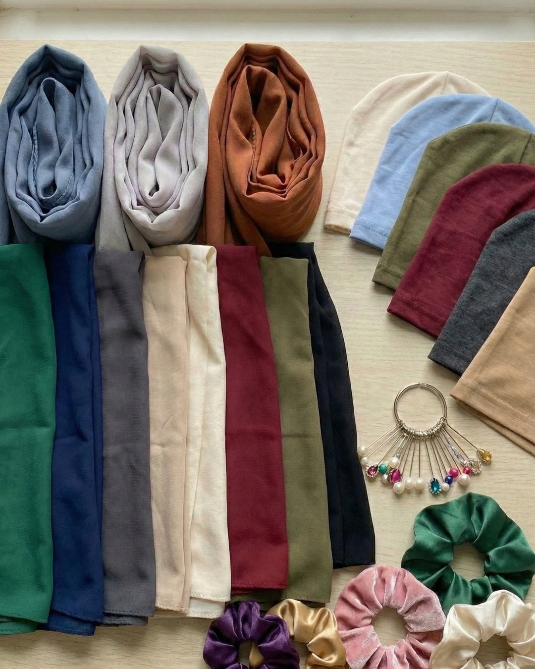 Elevate your everyday modest style with our Hijab Essentials Combo Deal, thoughtfully designed to offer comfort, elegance, and complete styling convenience. This set includes Six premium chiffon georgette hijabs, paired with Nine tube band hijab caps, Six ring of hijab pins, and Six silk scrunchie. Lightweight, breathable, and easy to style, this all-in-one bundle is perfect for daily wear, office looks, or casual outings—making it an ideal choice for modern modest wardrobes.