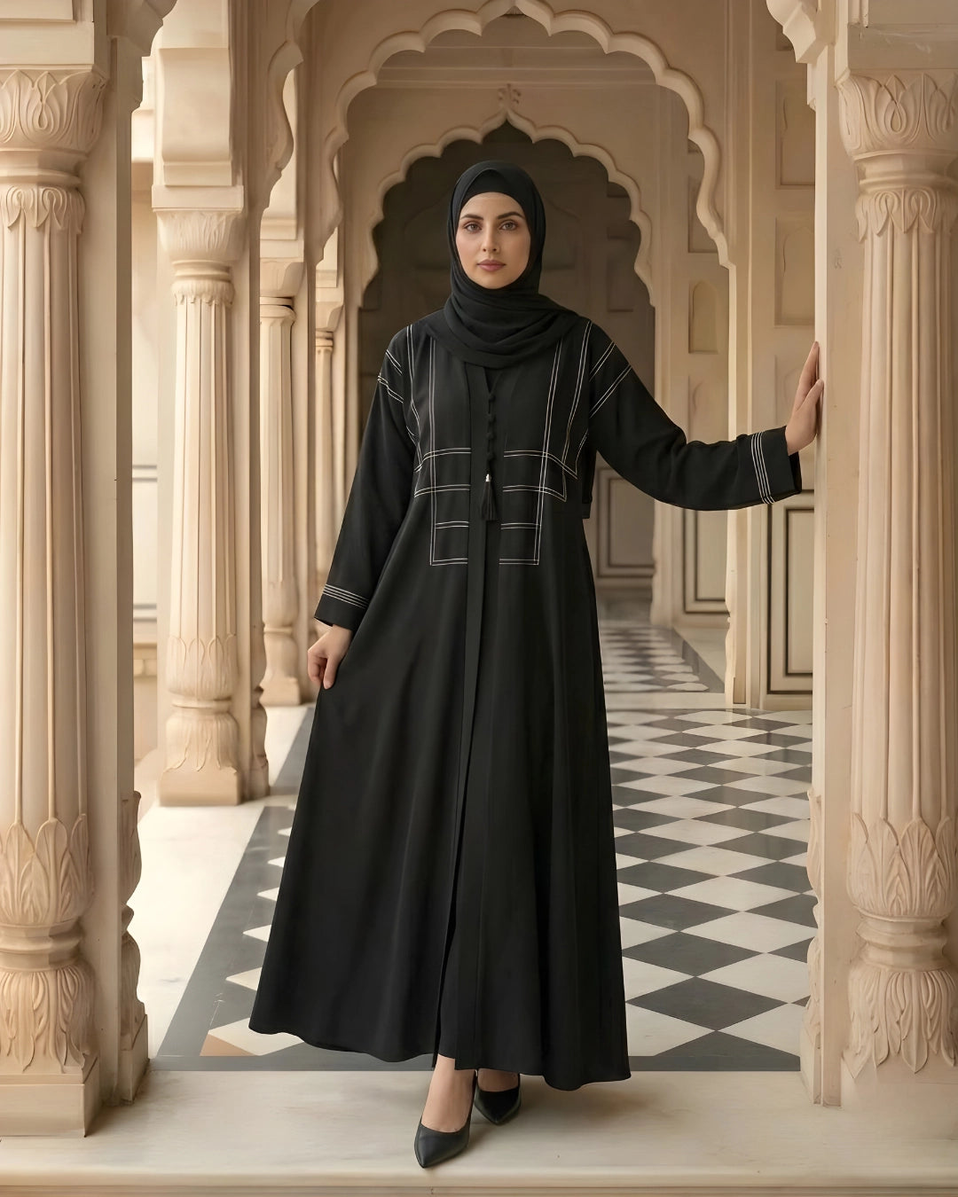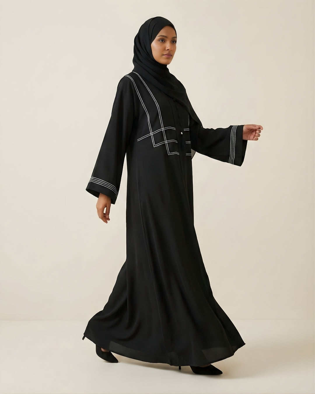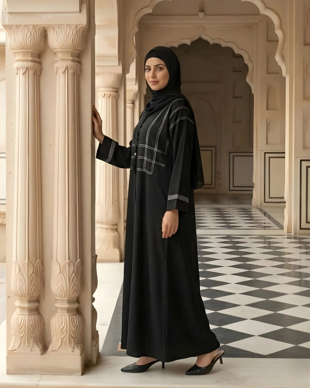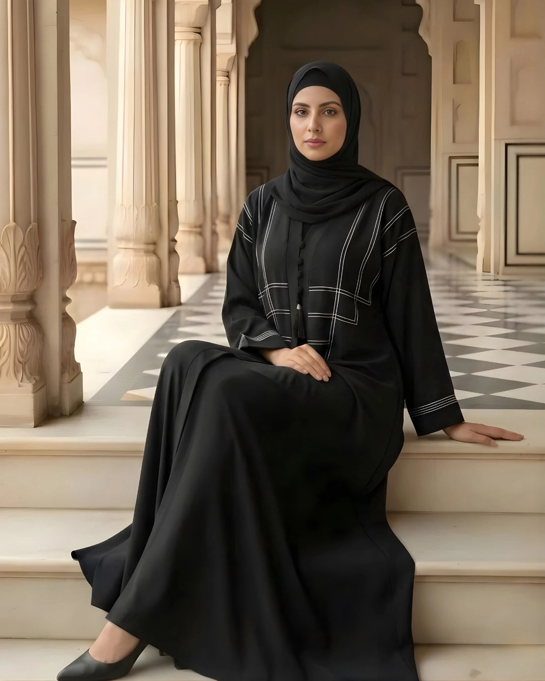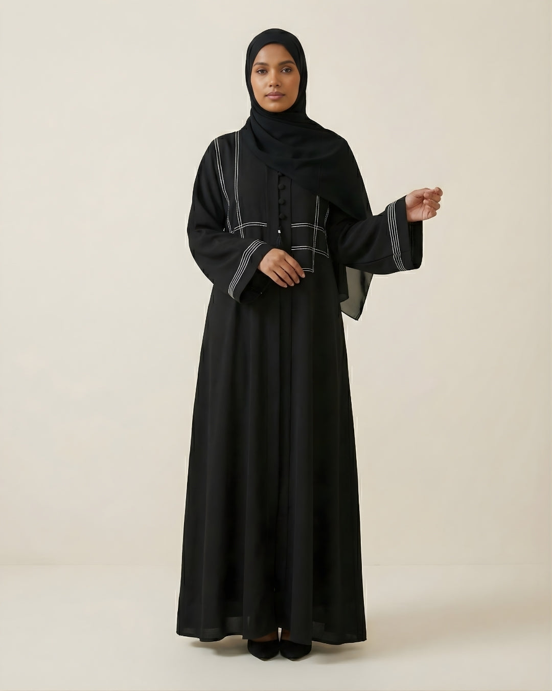 Sarah is a chic and graceful abaya designed to stand out with subtle contrast detailing. Made from smooth Nida fabric, this front-closed abaya features elegant white piping along the main front body and cuffs, complemented by a refined button-style placket. Its balanced design makes Sarah a perfect choice for casual wear with a touch of party-ready elegance.
