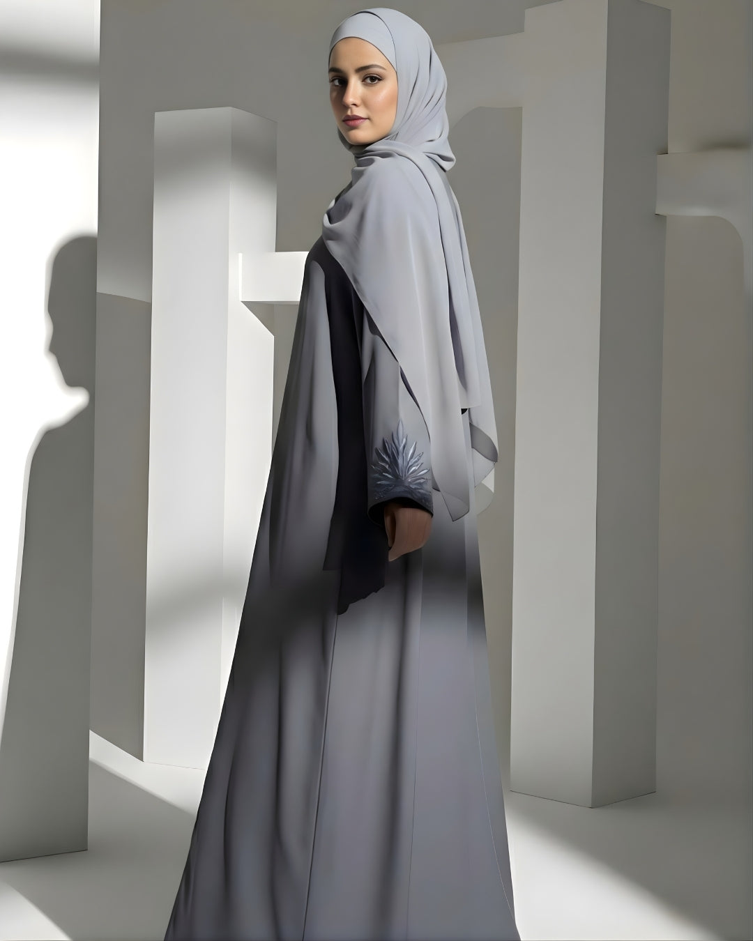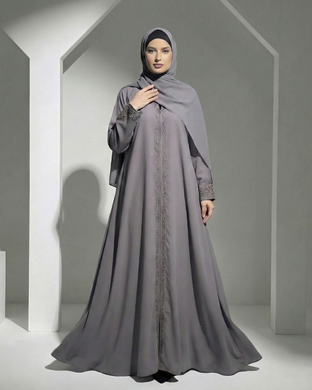 Sidra is a graceful abaya designed to bring timeless elegance to your modest wardrobe. Crafted from premium Nida fabric, this front-open frock-style abaya features delicate DMC stone work along the placket, adding a refined shimmer. The breathable, soft-touch fabric ensures comfort, while elegant embroidery at the cuffs and front placket enhances its sophisticated appeal—making Sidra perfect for formal and semi-formal occasions.