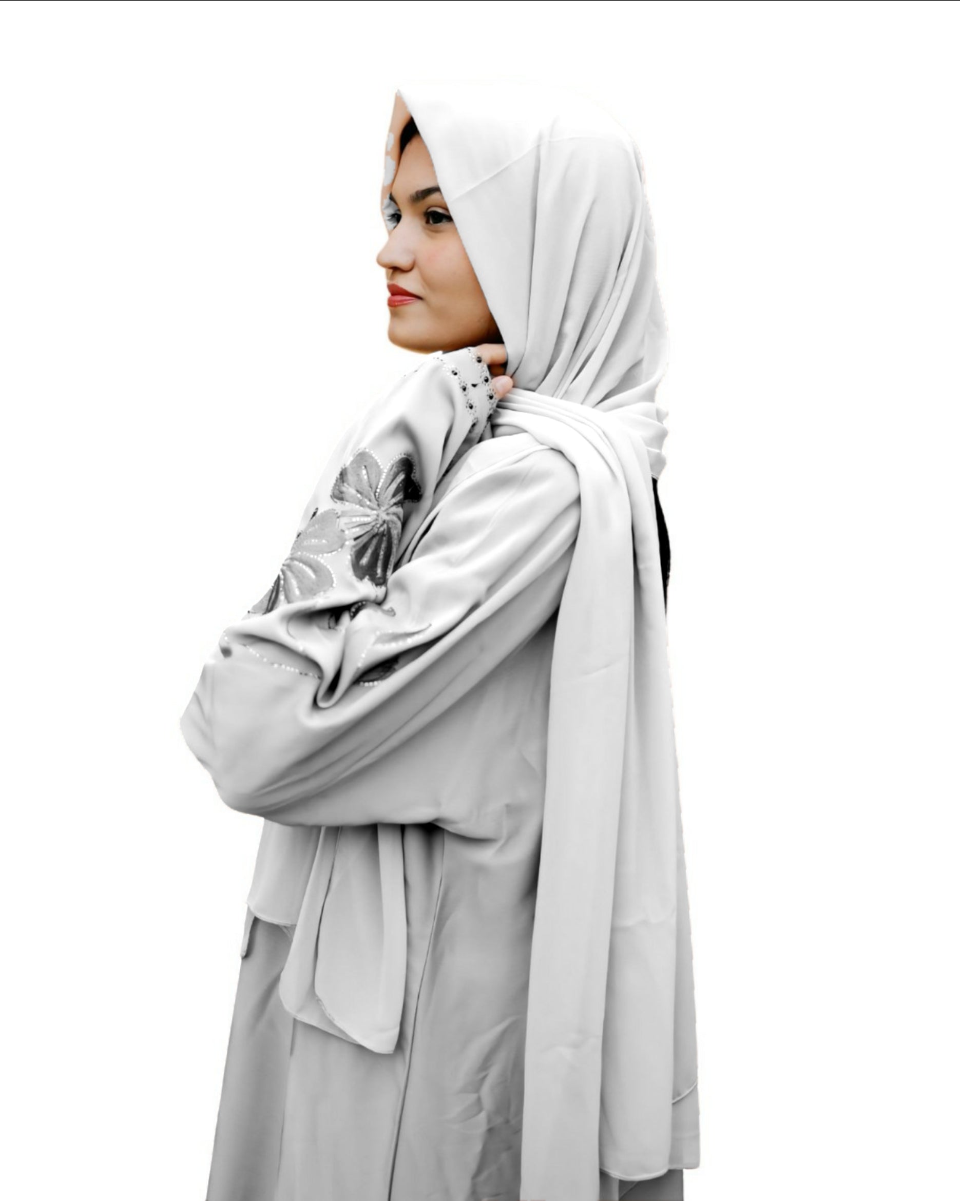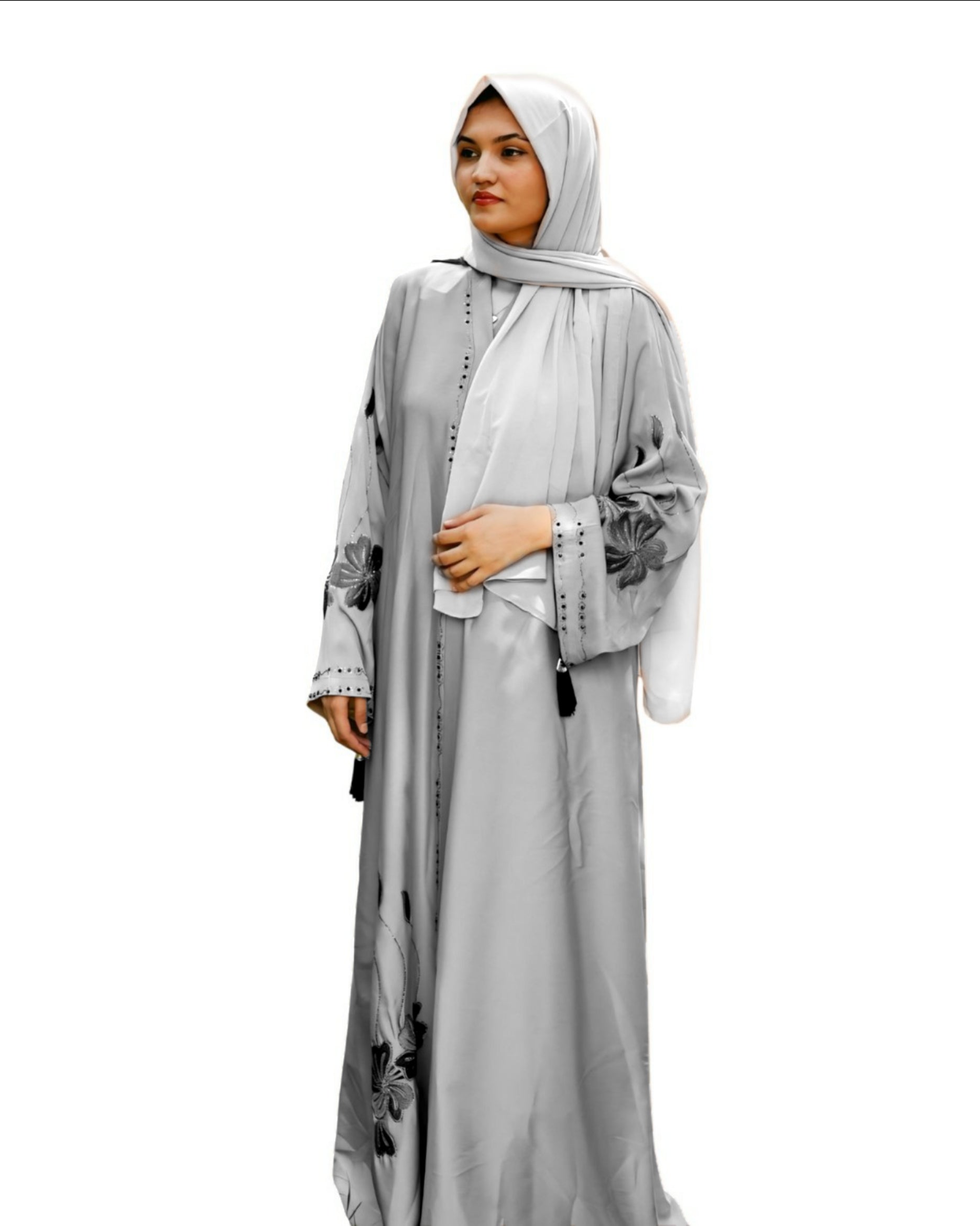 Discover the ZARQA - GREY Abaya, crafted from premium Zoom fabric that reflects elegance and sophistication. Perfect for parties, weddings, and special occasions, this designer abaya is tailored to enhance your graceful presence.
